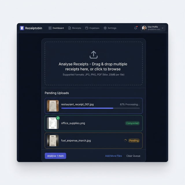 Drag & drop receipts, photos, or multi-page PDFs. Batch upload as many as you like.